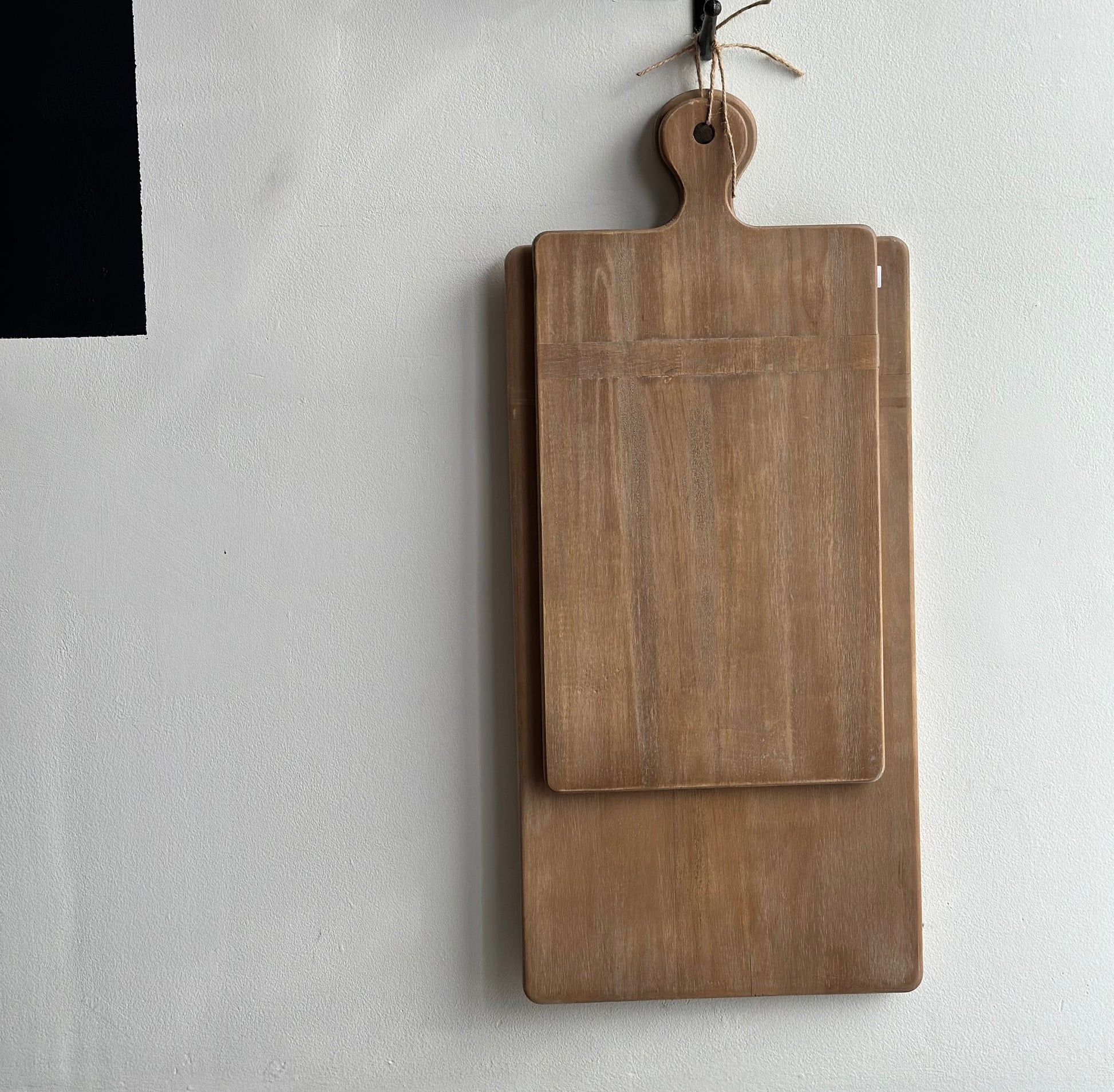 Inlaid wood detail and a warm gray wash make these cutting boards particularly special. Leaning against a backsplash or hung on the wall, a traditional look for kitchen or dining room.