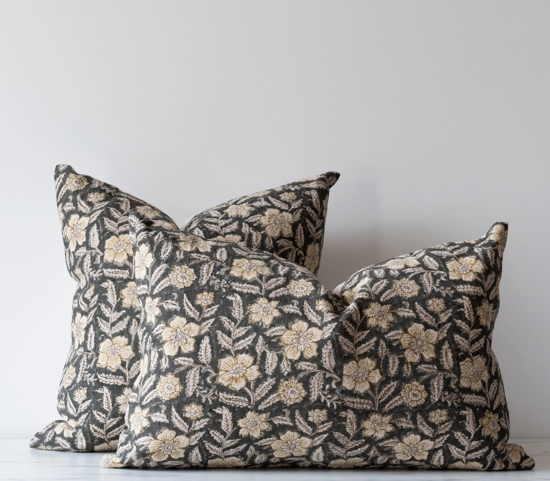 Botanical block print, featuring a floral motif on a moody green linen with a rustic quality and texture. This eye-catching motif stands out in any space adding cottage core charm and hand made artistry all at once. Hand block printed in India, this textile is truly unique and representative of hundreds of years of tradition and skill.